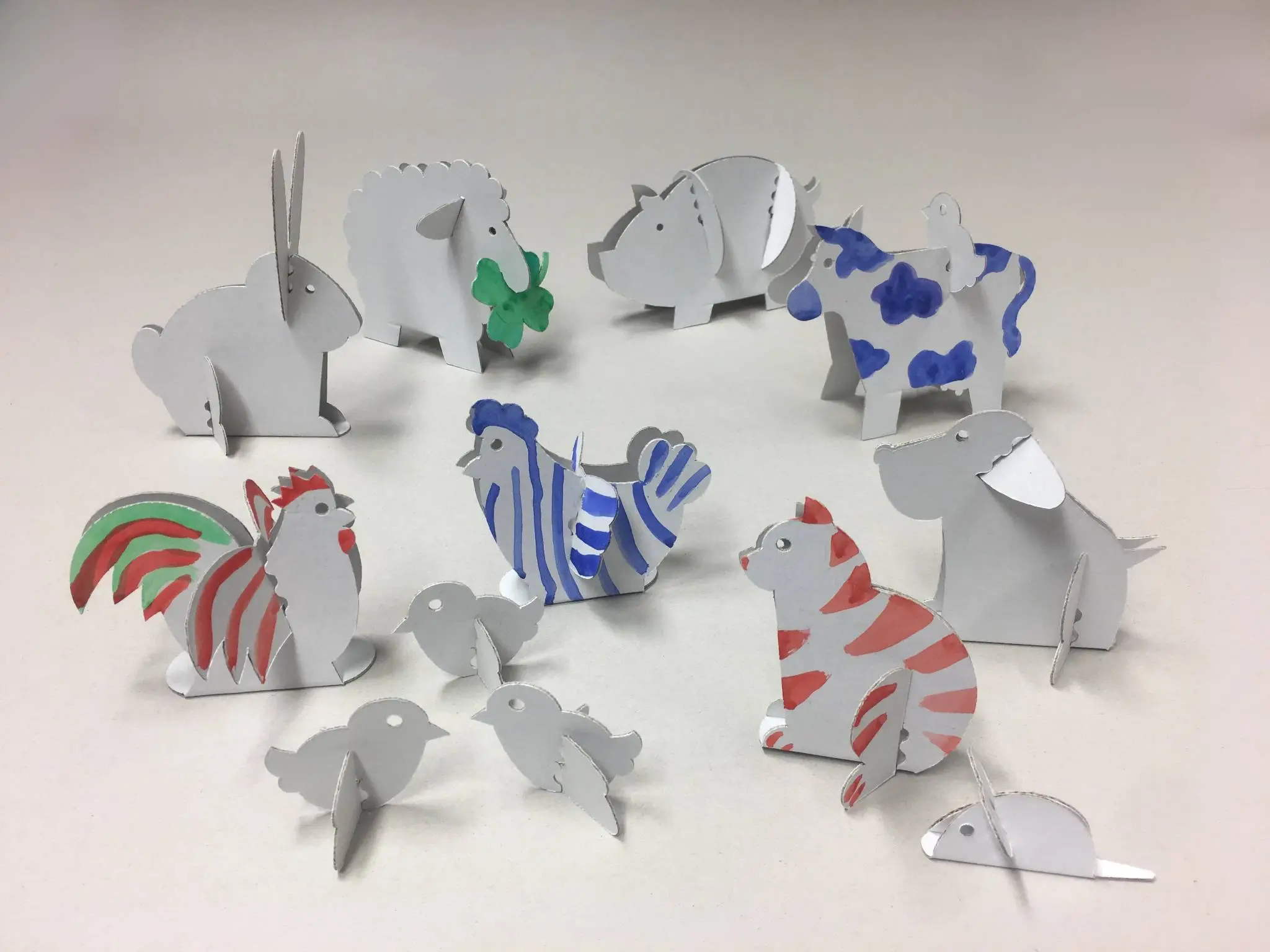 Mit dem Papp-Set aus 13 großen und kleinen Bauernhoftieren gestalten Kinder die tollsten und einzigartigsten Bauernhoftiere. Die aus hochwertiger, weißer Wellpappe durchdacht konstruierten Tiere lassen sich leicht zusammenstecken. Mit Farbe, Stiften, Glitzer und anderem Dekomaterial lassen sich die Tiere nach eigenen Wünschen gestalten. Somit steht dem Bastel-Spiel-Spaß nichts im Wege.